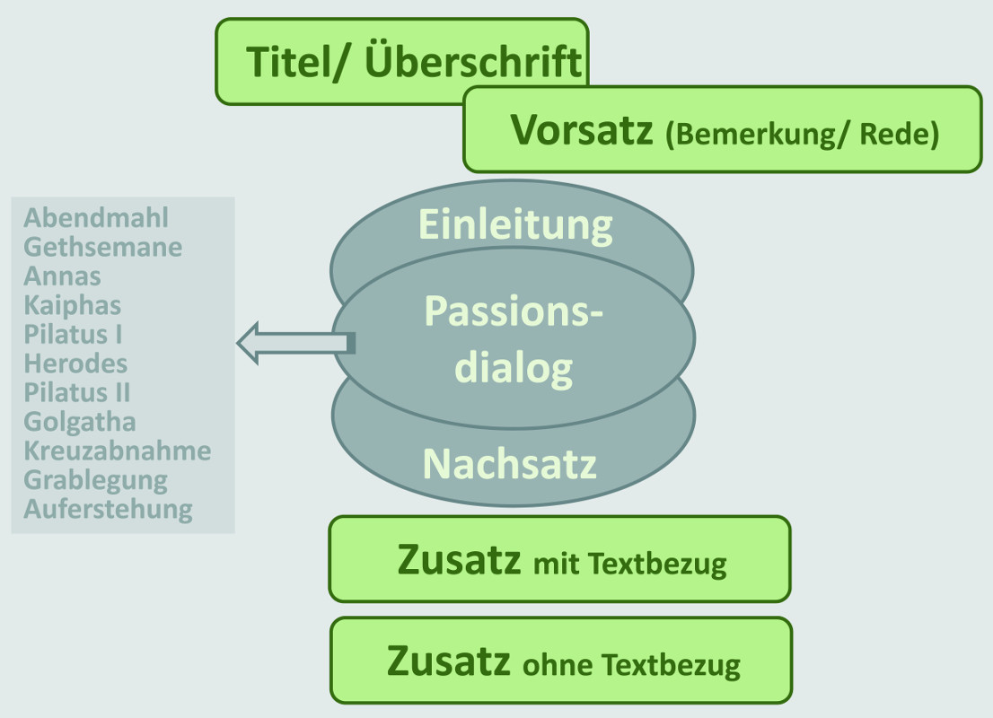 Das Textgebilde von ‘St. Anselmi Fragen an Maria’ setzt sich aus einem zentralen Haupttext und den rahmenden Textelementen zusammen: Der Haupttext besteht aus einer dem Dialog vorangehenden, zum Teil erzählenden, zum Teil schon dialogischen Einleitung, dem Dialog zwischen Anselm und Maria und einem nicht mehr zum Dialog gehörenden, sich aber auf die unmittelbar vorausgehenden Inhalte beziehenden Nachsatz. In diesem agieren die Figuren entweder noch – mit mehr oder weniger Distanz zum eigentlichen Geschehen – oder es wird von weiteren Geschehnissen berichtet. Je nach Fassung beinhaltet der Nachsatz Unterschiedliches, z.B. in den Prosatexten die Schilderung der Rache durch Titus und Vespasian, in den Verstexten Marias Auftrag, Anselm möge das Gesagte aufschreiben und verbreiten; hierzu zählt auch schon die Erscheinung Jesu im Haus des Johannes, die zwar zeitnah erfolgt, aber nach dem Passionsgeschehen im engeren Sinne zu verorten ist. An diesen aus Einleitung, Dialog und Nachsatz bestehenden Hauptteil gliedern sich fakultative Textelemente an: Überschrift und/oder Vorsätze sowie Zusätze mit und ohne Textbezug.