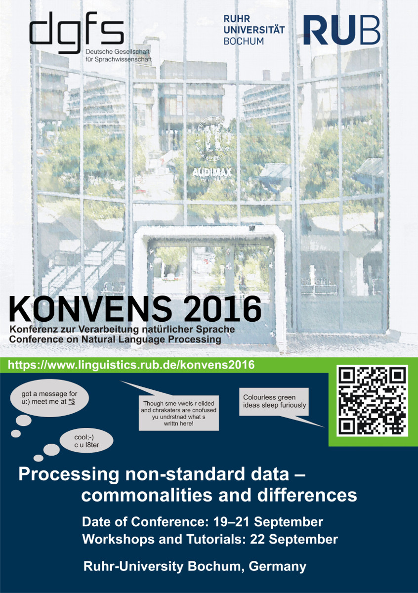 The 13th KONVENS is organized by DGfS-CL and hosted by the Linguistics Department at Ruhr-University Bochum. The conference will take place September 19–21, 2016 in Bochum (Germany). Associated workshops and tutorials will take place on September 22, 2016.